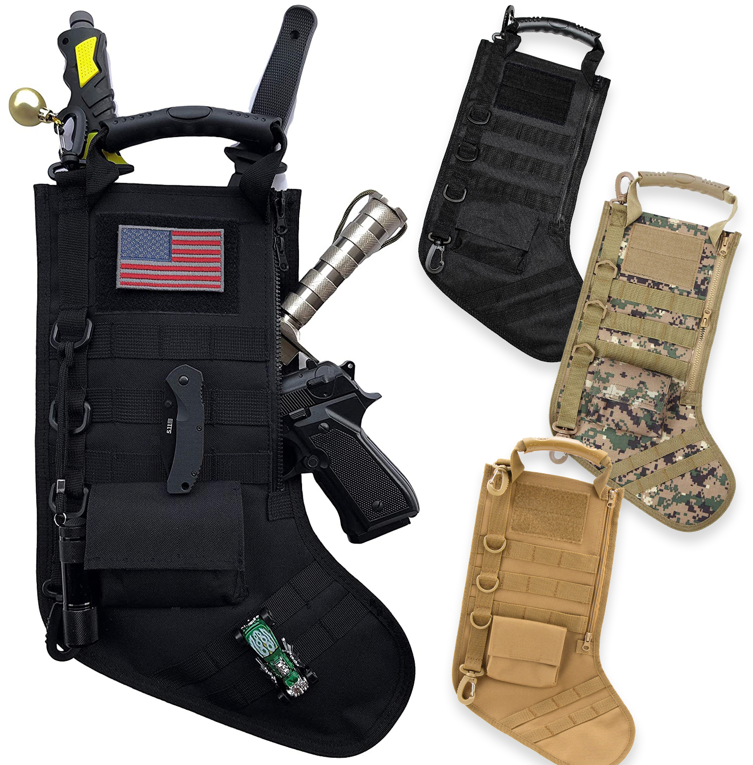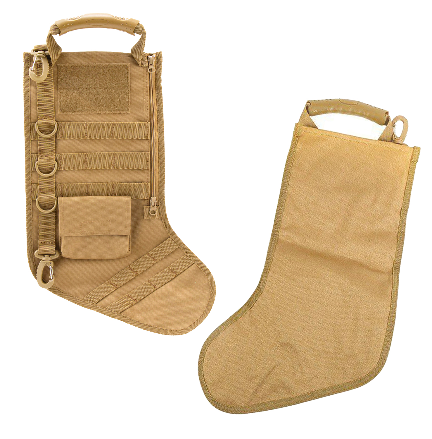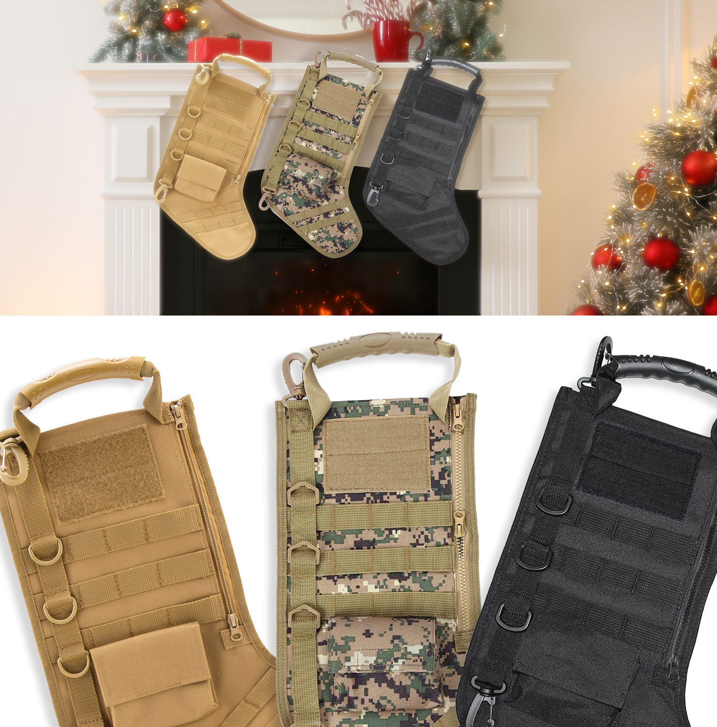Hang it by your fireplace, in your man cave, by your foxhole or anywhere else where it can be seen and put to use. This real MOLLE spec stocking features a vertical zipper opening, carry handle, and a swivel stocking hanger with a clip. It has a hook-and-loop velcro display location on the front to add personalized name tape patches. It comes in three colors – Camo Green, Desert, or Ops Black. Or you can purchase all three in a bundle. Get the perfect Christmas gift this year – ORDER NOW!