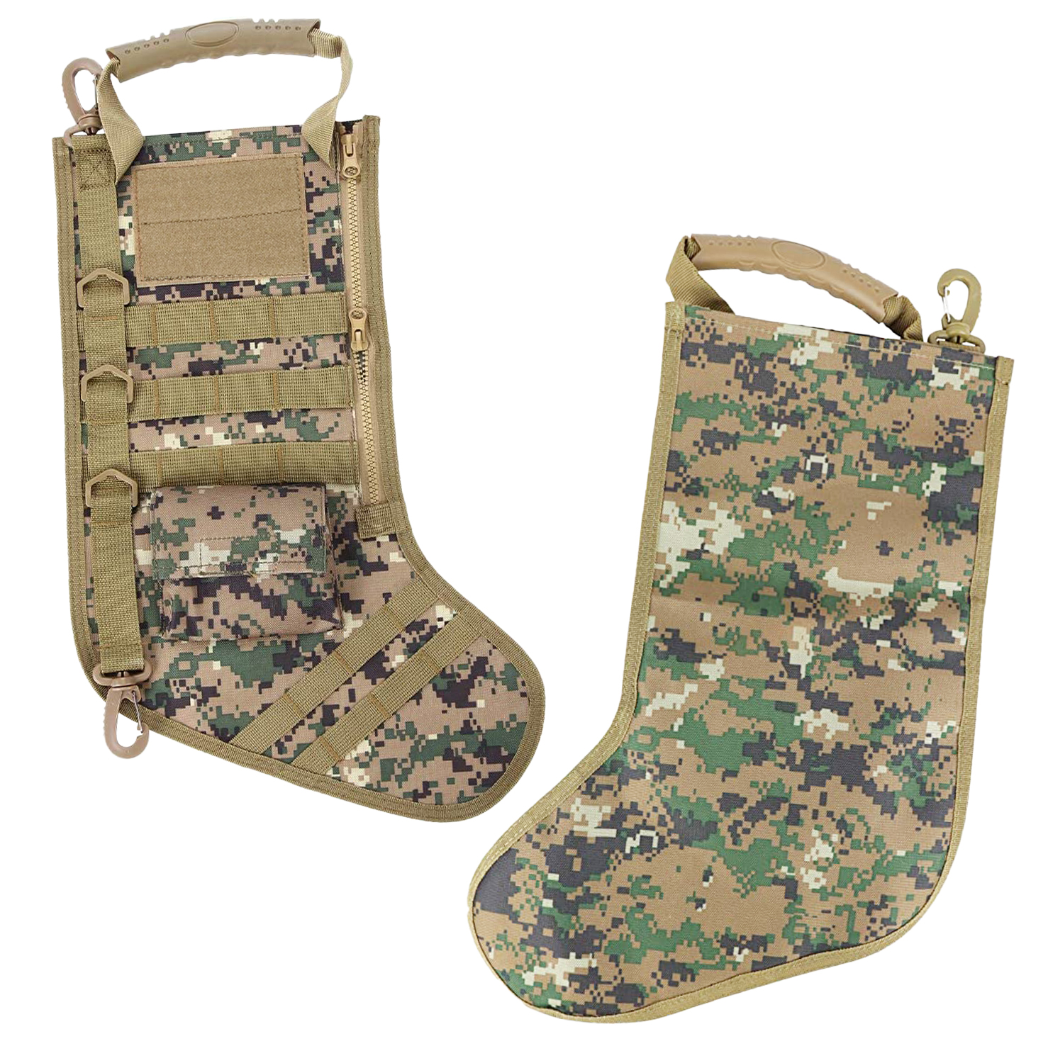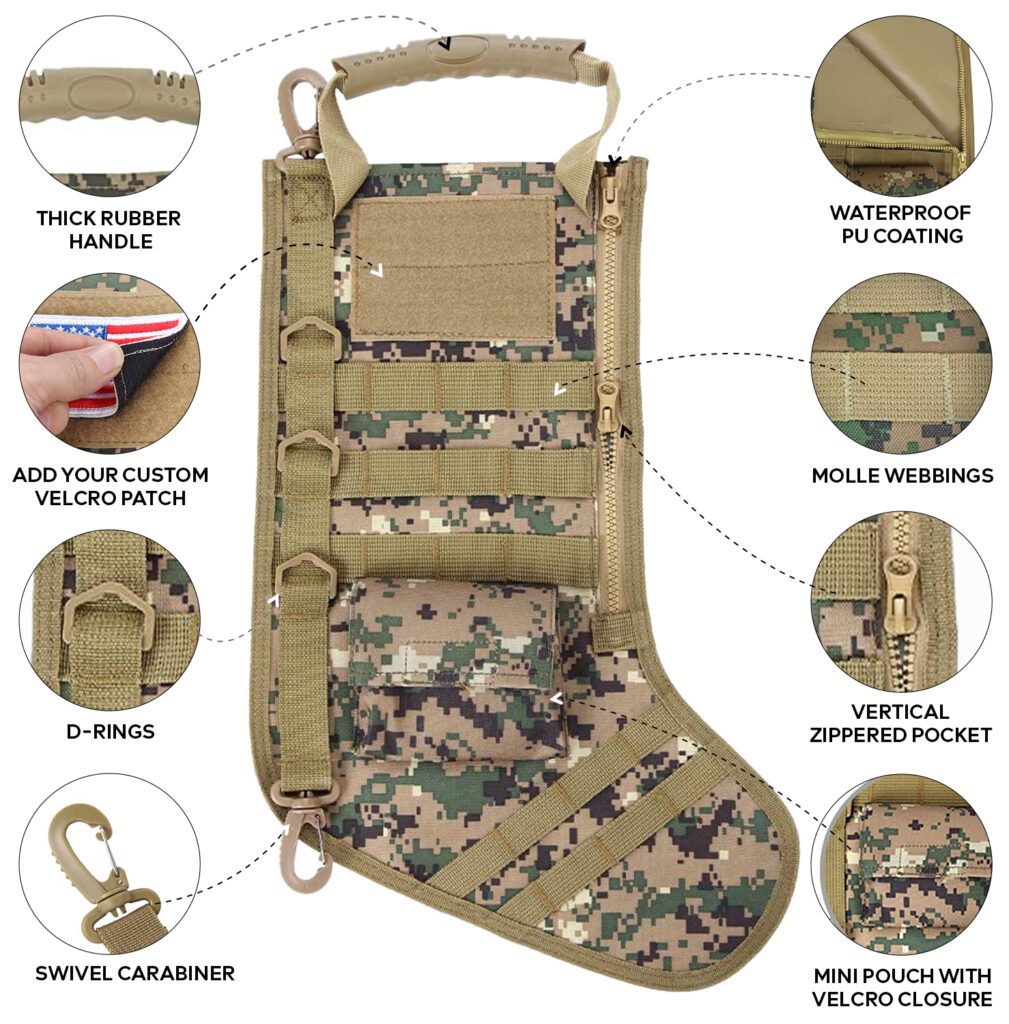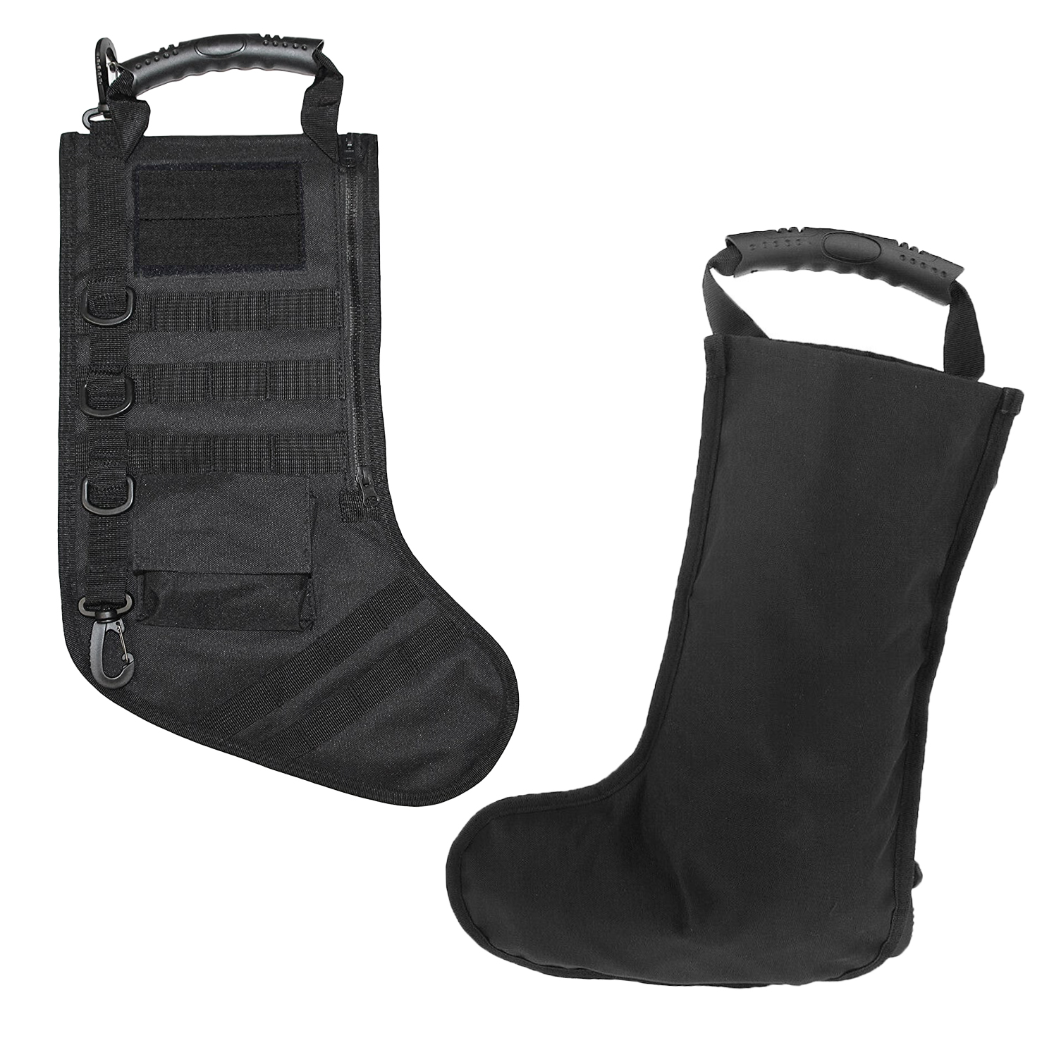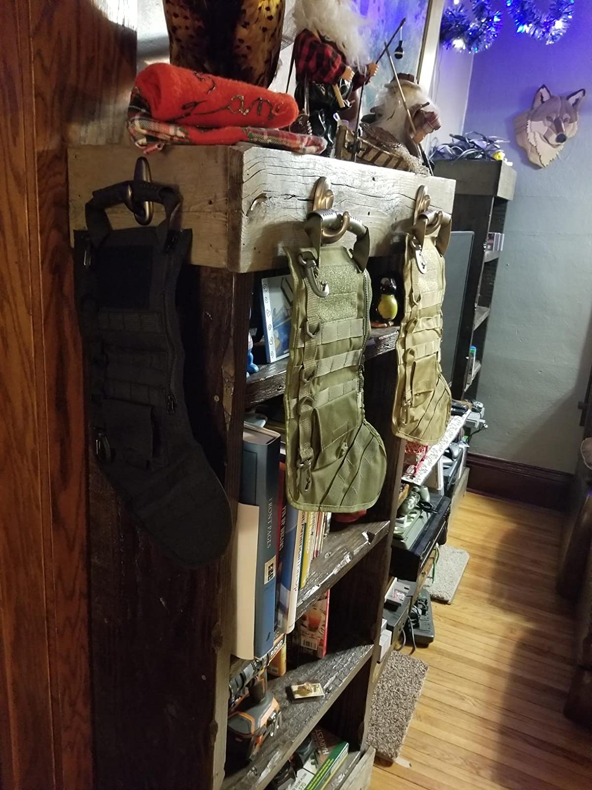 Hang it by your fireplace, in your man cave, by your foxhole or anywhere else where it can be seen and put to use. This real MOLLE spec stocking features a vertical zipper opening, carry handle, and a swivel stocking hanger with a clip. It has a hook-and-loop velcro display location on the front to add personalized name tape patches. It comes in three colors – Camo Green, Desert, or Ops Black. Or you can purchase all three in a bundle. Get the perfect Christmas gift this year – ORDER NOW!
